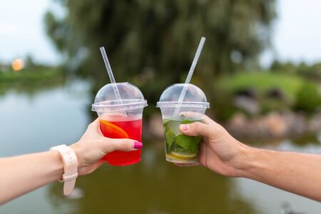 The girl and fella during the walk holds in hands a fresh drink on a background of green park.
