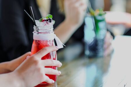 Close up of female hands holding glass jars with refreshing summer drinks.