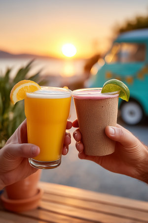 Friends clink craft beer cans beside food truck at sunset, warm glowing flare creating a relaxed mood. Concept of social gatherings, food truck culture, friendship.