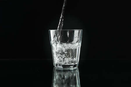 Pouring purified fresh water in glass on mirror background