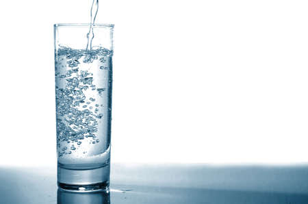 A stream of fresh water pours into a glass on a blue background