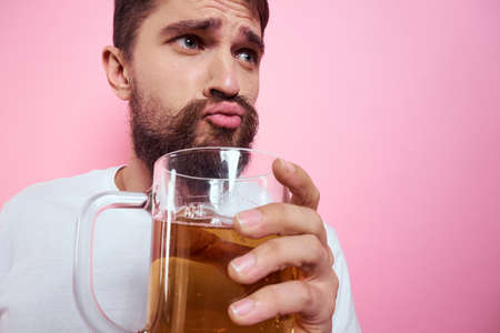 Drunk man with a large mug of beer On a pink background and a white T-shirt relaxed view of a thick beard