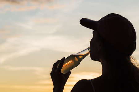 Silhouette of girl in baseball cap drinking soda water from glass bottle and looking at sunset sky. rear view of female