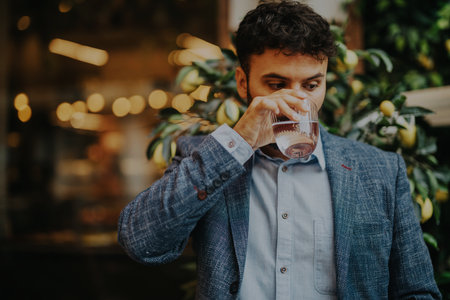 man with a Latin look drinking from the glass with clear liquor, like crystal tequila, vodka or mezcal