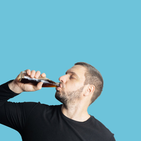 Dark-haired bearded man in dark clothes drinks a dark drink from a bottle with his eyes closed