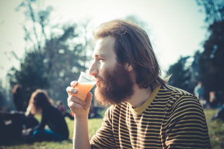 Close up of a handsome young man drinking orange juice while looking at the camera on an out of focus background. Leisure and healthy food concept.
