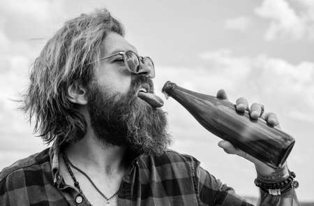 concept of alcohol drinking. man drink from glass bottle. brutal man with water. refresh with water. bearded man wear checkered shirt. casual male relax while drinking beer. Refreshing affect