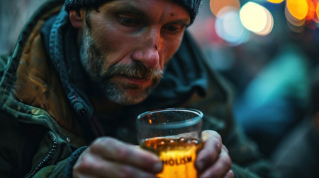 Drunk and depressed lonely man holding a glass of vodka