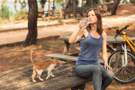 Cyclist woman drinking water near to the bicycle in a public park. Sports activity for a healthy lifestyle.