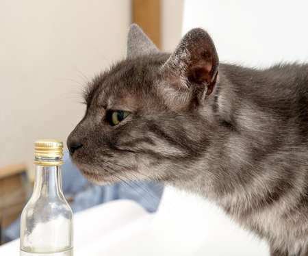 closeup portrait gray domestic cat smells chemicals indoor