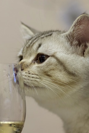 Beautiful short hair cat at home drink water from glass on kitchen table. Adorable domestic pet concept.