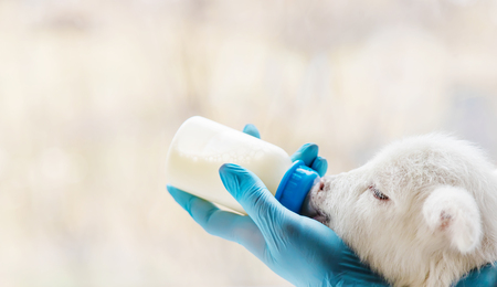 little goat in the hands of a veterinarian to feed. In tutorial focus. nature.