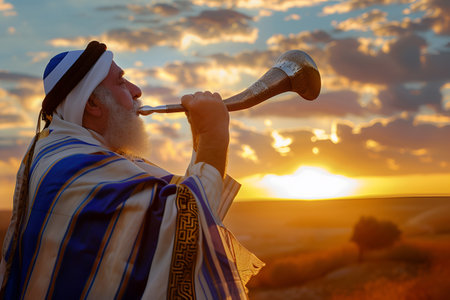 A man traditionally wearing Jewish attire blows a shofar at sunset, symbolizing the Yom Kippur holiday, with the sky painted in warm hues of gold and orange.