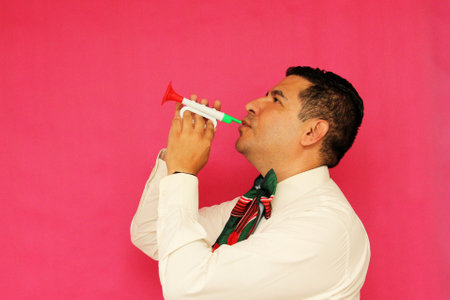 Dark-skinned Mexican adult man with tricolor bow plays a toy trumpet with the colors of the Mexican flag to celebrate the national holidays of Independence and Revolution Day