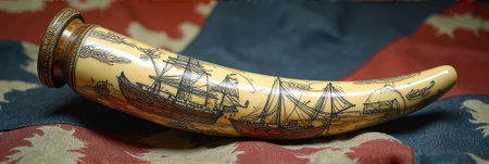 Intricately carved antique scrimshaw on tusk with nautical ship designs. That the image is generated using AI.