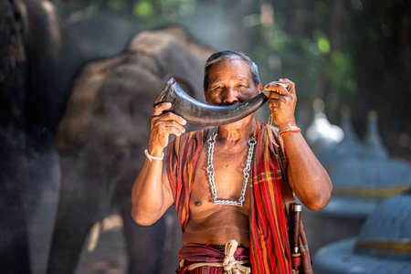 Face of senior mahout in Ordination parade on elephant\'s back Festival