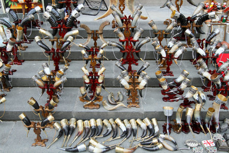 Artisan market showcases beautifully crafted drinking horns in various designs. Tbilisi, Georgia