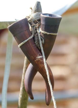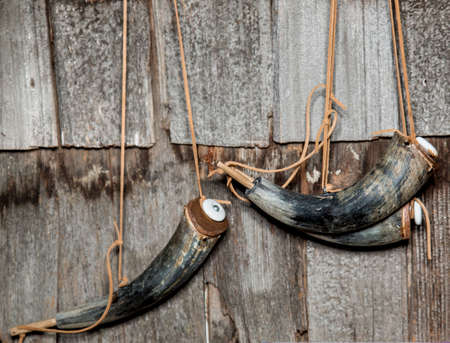 Medieval horn for alert hanging on wooden stand. Middle ages life concept. Close up, selective focus