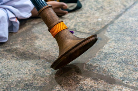 Close-up of a nadaswaram's wooden bell, a South Indian double reed wind instrument, reflecting on a wet stone surface.