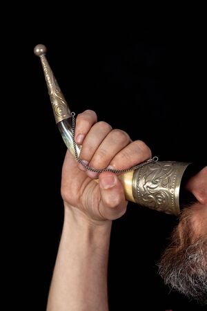 Portrait of an orthodox adult Jewish man blow Shofar (ram's horn) outdoors under clear blue sky, on the Jewish High Holidays in Rosh Hashanah and Yom Kippur.