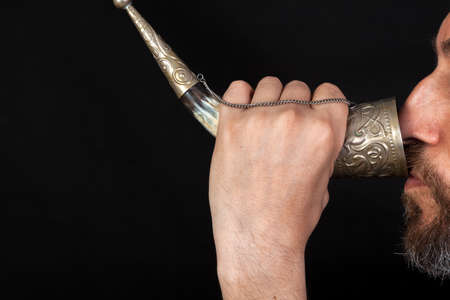 man with a beard holds the horn for wine with his right hand and drinks from it. Profile view
