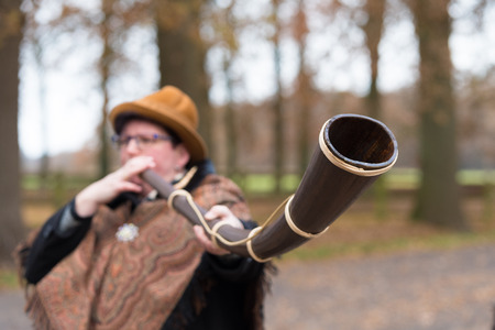 OLDENZAAL, NETHERLANDS - NOVEMBER 27, 2016: Unknown man blowing a so called midwinterhorn, a traditional handmade wooden instument. It is used in the advent period in some eastern parts of the netherlands