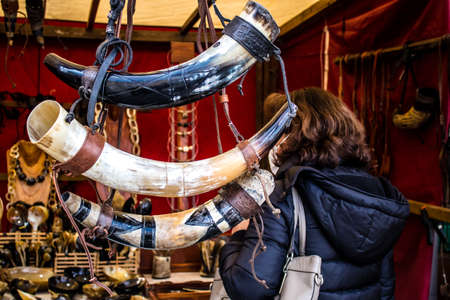 Reims, France - May 28, 2022 Artisan stall selling their wares at the medieval market during the Johanniques festivities, back after a two year hiatus following coronavirus outbreak
