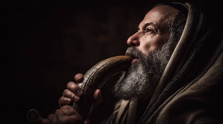 Man blowing shofar during Yom Kippur in Austrian synagogue, deep tradition, dramatic light