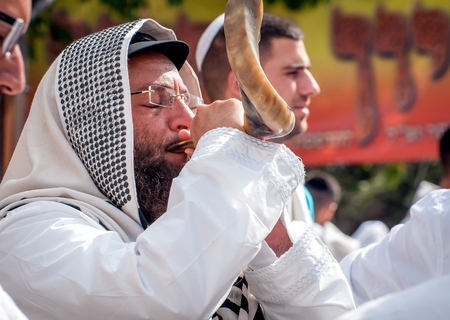 Jewish hasid blows Shofar. Uman, Ukraine - 21 September 2017: Rosh Hashanah, Jewish New Year.