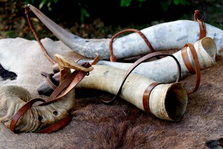 A close-up of an authentic Viking drinking horn, bound with studded leather.