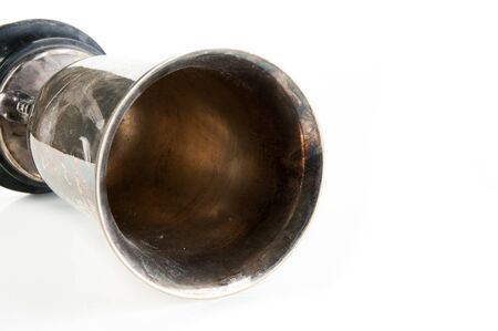 Vintage metal cup with lid isolated on white. Copy space for text.