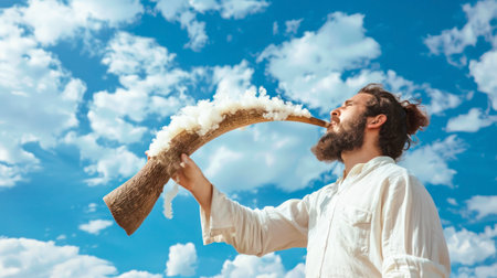 A man blows a beautifully detailed shofar, enveloped in swirling smoke, during the sacred Yom Kippur celebration, evoking deep tradition and spirituality.
