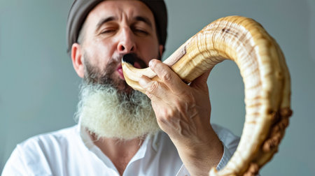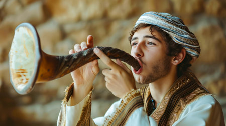 Jewish man blowing shofar horn in traditional attire celebrating a religious festival. Concept of Jewish New Year holiday Rosh Hashanah