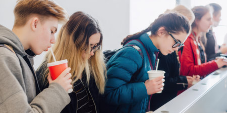 Group of diverse high school students enjoying a drink from disposable cups while waiting in line, depicting daily adolescent life and moments of relaxation