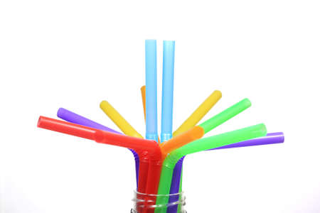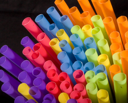 Collage of plastic cups and colorful drinking tubes on a decorative background