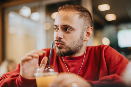 Young man sipping cold drink through blue straw with surprised expression, view from inside. Concept of fun digital content, advertising campaigns, lifestyle branding, parties and beverage promotion.