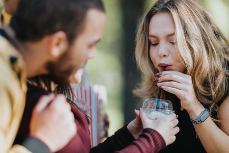 Friends share a drink in the park, enjoying a casual outdoor moment together
