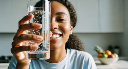 Happy young african american woman holding a refreshing glass of sparkling water, smiling brightly in a modern kitchen, promoting hydration and healthy lifestyle.