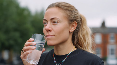A young woman savors a moment of refreshment as she drinks clear water from a glass outdoors. The background showcases a lively urban scene, surrounded by greenery that enhances the refreshing vibe.