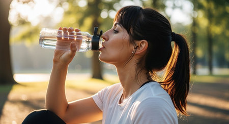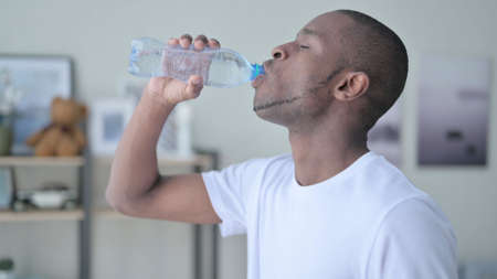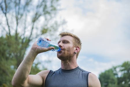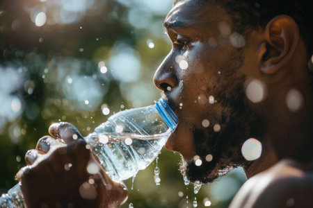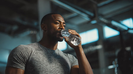 A man is peacefully drinking water from a bottle, rehydrating himself after physical activity. The focus is on his actions and the importance of staying hydrated.