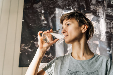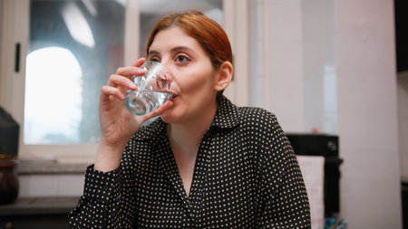 A woman takes care of her health by washing down pills or vitamins with water, maintaining her wellness routine