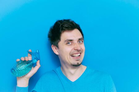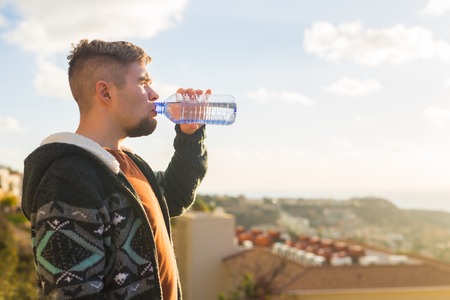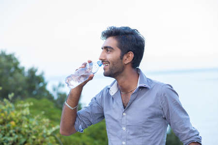 Hydrate yourself. Man smiling in profile about to drink from a bottle of water isolated nature trees and sea background