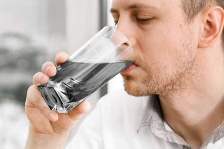 A man holds up a glass of sparkling spring water admiring its crystal clarity