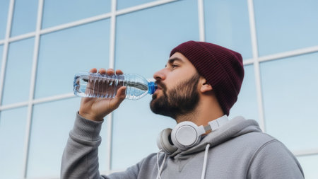 Young man wearing headphones drinking water from a clear plastic bottle outside a modern building