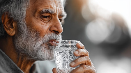 man drinking water from a glass, showing his face with elderly gray hair and beard in a close up shot