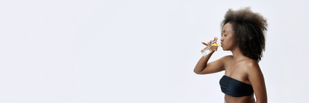 Young, beautiful african woman taking care after health and outlook, drinking water with lemon against white background. Concept of natural beauty, skin care, health, fashion, wellness. Banner, ad