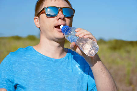 sporty guy with glasses drinks water from a bottle during morning jogging and sports