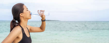 Asian woman drinking water from bottle on tropical beach, Summer Beach Vacation Concept.