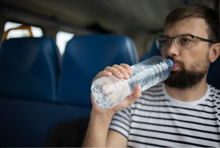 Young man while traveling is drinking a transparent plastic bottle in subway train