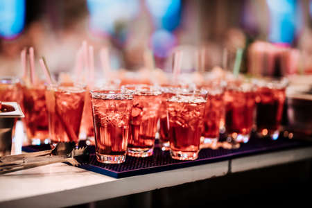 Variety of alcoholic cocktails on the bar counter in a nightclub.
